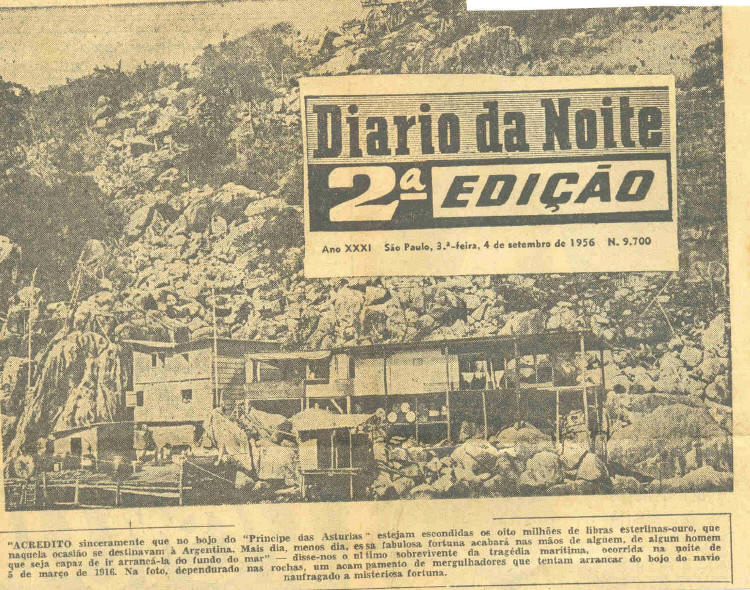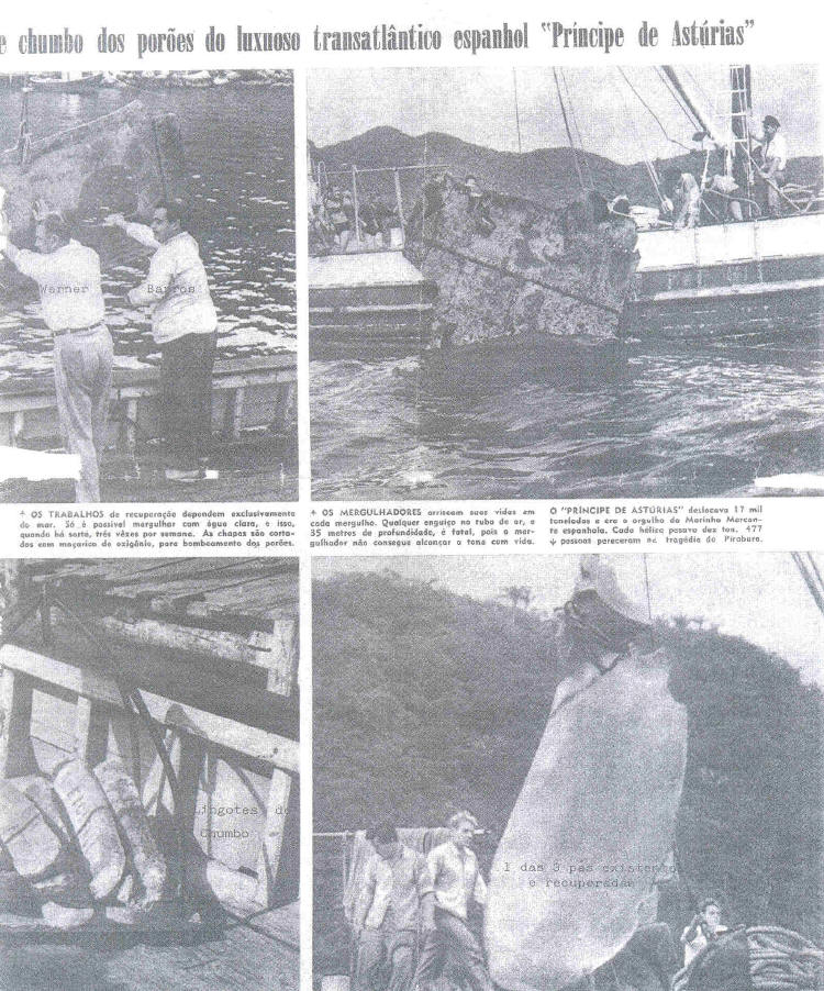No início de 1953 conheci um dos Fialdini (rede de carnes frescas) Eles conseguiram a concessão para explorar o Principe de Asturias e convidaram-me para visitar o local. Evidente que voltei dias após para ficar e mergulhar, para desespero de meus pais. Havia 2 gre- gos escafandristas, pai e filho, João e Áureo e alguns aprendizes de mergulho, eu inclusive.A bomba de ar,antiga,ainda era de roda-mani- vela,manual,sem filtro.A Cia. Estanífera do Brasil entrou no negócio, junto com um médico Dr Nino Gallo e Raul Roas Nieto. Veiu repre- sentar o Raul o Adolpho Melchert de Barros, sua esposa Leda com o irmão Diderot e primo Oene que deram alguns mergulhos para co- nhecer. Eu dei cerca de 100 mergulhos em onze meses que trabalhei. Os mergulhadores gregos enrolavam quando as condições não esta- vam muito favoráveis. Ai chegou o carioca Werner Krauss com um pequeno compressor, uma válvula de baixa pressão,um tubo de poli- etileno de 50 metros para levar ar até o Principe(média de 28 a 30 m de profundidade e 30 m.da arrebentação no costão). Os escafandris- tas gregos logo foram embora com o desprestígio . Com o Werner aprendi os dois sistemas : escafandro e livre. Não tínhamos roupas de neoprene e enfrentamos o pior inverno da década. Colocávamos malhas de lã, como se vê na foto 5 e short. Aguentávamos 15 minu- tos no máximo e ficávamos nos recuperando do frio intenso no sol sem conseguir articular uma palavra por 5 minutos, tanto que tremí- amos ao voltar. Aguenta coração. O eletricista Franklin suportava até 45 minutos mergulhado, incrível, e sem saber nadar. Construimos um acampamento de madeira no Saco da Pirabura. Fizemos um sistema de caçambas com roldanas e cabos de aço pa- ra levar o material retirado do fundo do mar até o topo do morro da Pirabura, (foto 8 ) e depois mudar de caçamba e descê-lo até o ancoradouro no Saco. Havia uma famigerada bomba de sucção para retirar a areia do fundo para poder se enxergar os lingotes de chumbo. Eles tinham em média 47 kg dos 50 kg originais devido à corrosão. Maís parecia um jogo de palitos chinês. Cada lingote estava preso na ponta pelos outros, embaralhados. Era preciso deslocar cada um com uma alavanca de ferro de 1,5 m. e depois levá-lo, e levantá-lo para jogar dentro da caçamba. A visibilade era de cerca de 30 a 40 cm devido ao rebojo por estar perto da arrebentação,e escuro devido aos 30 m de profundidadeUsávamos luvas reforçadas mas sempre havia cortes e não tínhamos a menor idéia da contaminação pelo chumbo- a plumbose. Mas fa- lar em segurança no trabalho, naquele servicinho nada delicado... Quando raras vezes a atividade exigia menos movimentação, descíamos de escafandro antigo para maior conforto térmico e duração do mergulho. O Principe tem casco duplo o que dificul- tava, e que era removido com dinamite aos pedacos pois não tín- hamos maçarico de corte submarino. Em quase um ano de traba- lho recuperamos cerca de 100 toneladas de chumbo em lingotes. Por azar os preços estavam baixos(cerca de 13,00 o kg de chum- bo). O cobre e o estanho estavam bem abaixo do chumbo devido ao peso específico ao ser estocado, pois o Principe emborcou da metade até a popa ao acomodar-se nas pedras e areia, após o choque. Devem estar de 5 a 10 metros enterrados na areia, o que vai dar quase 50 metros de profundidade. Aí quase no final dos trabalhos veiu um técnico russo que mandou retirar a tal famigerada bomba de sucçãoPassamos a aspirar tudo,até alguns parafusos,porcas grandes,injetando ar comprido na boca submer- sa do mangote de 6 polegadas.Isto após meses de sacrifício pois um dos mergulhadores tinha que entrar na água meia hora antes, para abrir uma válvula para evitar coluna de água que impedia a sucção (técnica serrr técnica,não tínhamos experiência alguma). Também, quando estouramos com dinamite a porca da hélice de boreste, a única que restou (somente 3 das 4 pás), foi preciso cortar cada pá em pedaços em S.Paulo, pois na época não havia cadinhos grandes para poder fundir o bronze das pás.Quase deu prejuizo. Eu sai 2 a 3 meses antes da empresa falir.Comprei um compressor portátil a gasolina, uma válvula baixa pressão, man- gueira de plástico flexivel, fiz cartões de visita profissionais.Qua- se peguei um serviço no pier do Iate Clube do Rio de Janeiro. Mas aí casei,vieram os filhos e o equipamento enferrujou depois de muitos anos sem usoMas foi um casamento muito feliz, valeu. Na época dos mergulhos eu pegava as cartas da minha noiva no Bar Buraco da Onça em S.Sebastião, nosso endereço postal.